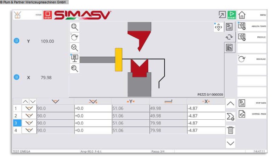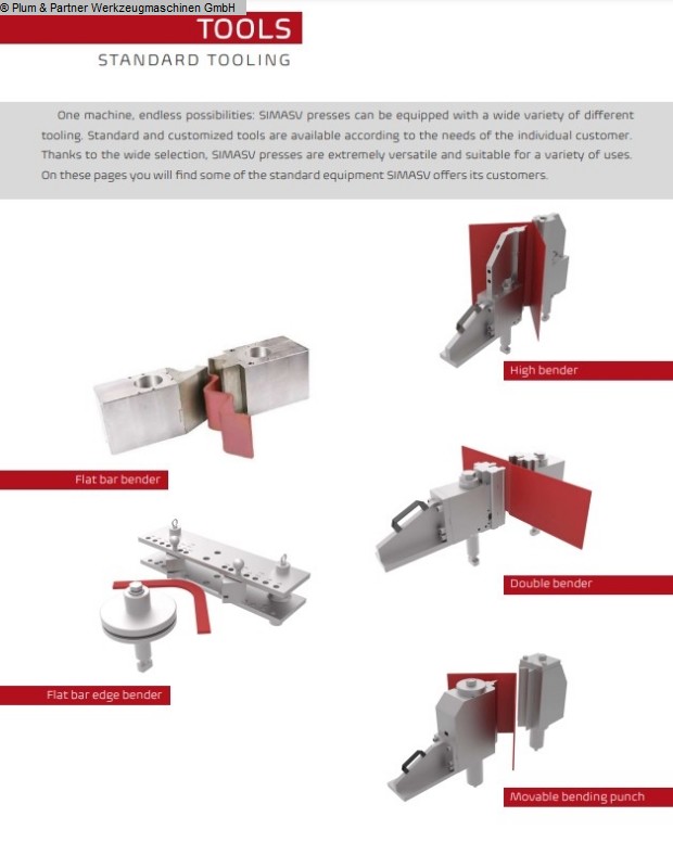 Neue hydraulische CNC-Horizontal - Biegepresse mit 4 Vorteilen gegenüber anderen Herstellern: 1) UNTENLIEGENDER Zylinder erlaubt 360 Biegungen! 2) Bedienung von vorne und nicht seitlich 3) Patentierte konische Werkzeugaufnahme 4) Biegung unter Druck, stufenlos. Programmierung und Steuerung des Arbeitshubs und des Seitenanschlages durch elektronische 2-Achsen CNC-Steuerung mit 7" oder 11" Touchscreen, auch unter Druck mit stufenfreiem, feinen Vorschub, so dass der gewünschte Biegewinkel ohne vorherige Versuche zu erzielen ist. Dank dieses Systems eignet sich die Maschine sowohl zur Herstellung von Prototypen als auch für die Produktion großer Serien. Der motorische Seitenanschlag ist mit einem bürstenlosen Motor angetrieben und in den Längen 1,2 + 2 + 3 m verfügbar. STANDARD-CNC-FUNKTIONEN Biegeachsen-, X-Achsen- und Y-Achsen-Verwaltung Alphanumerische Programmverwaltung Keine Begrenzung der Anzahl der Programme Möglichkeit, Programme in Ordnern zu organisieren Werkzeugeditor über Vorlagen oder DXF-Import Möglichkeit zum Datenaustausch über USB-Stick oder über Netzwerkverbindung mit dem Büro Optionale Unterstützung für Industrie 4.0-Funktionen: Terminplanung und detaillierte Berichterstattung über Produkt- und Anlagenstatus Schnelle Programmierseite Bearbeitung von 2D-Teileprofilen einschließlich Radien und Quetschungen 3D-Simulation einschließlich automatischer oder manueller Suche für die beste Biegefolge Geführte grafische Werkzeugeinrichtung DXF-Export zum Schneiden Verwaltung der Teilezählung und Produktionszeiten Möglichkeit, Bilder und PDFs an das Programm anzuhängen 3D-CNC-FUNKTIONEN Bearbeitung von 3D-Teilen über einfachen integrierten Editor DXF-Import von Teilen, auch mit Winkel- und Radiusinformationen 3D-Simulation einschließlich automatischer oder manueller Suche nach der besten Biegesequenz Optionaler STEP / IGES-Import von Teilen Automatische Werkzeugberechnung Reichhaltiges Werkzeugsortiment für die verschiedensten Anwendungen lieferbar. SIMASV ist Hersteller von Qualitätsmaschinen seit 1957 und ISO zertifiziert. LAGERHALTENDER HAENDLER MIT AUSSTELLUNGSHALLE VON 1600 m².
