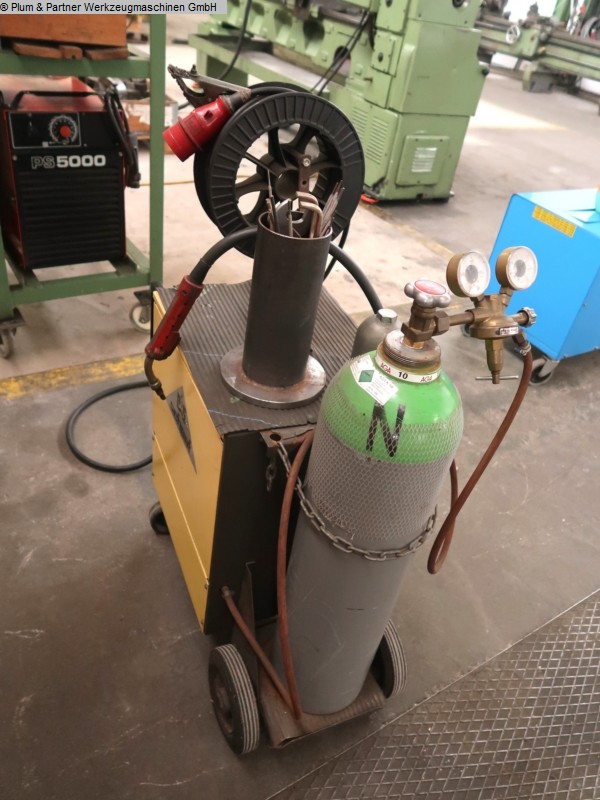 Schutzgasschweißgerät mit Schlauchpaket und Gasflasche. Es handelt sich um eine Gebrauchtmaschine, daher verkaufen wir unter Ausschluss jeglicher Gewährleistung. LAGERHALTENDER HAENDLER MIT AUSSTELLUNGSHALLE VON 1600 m².