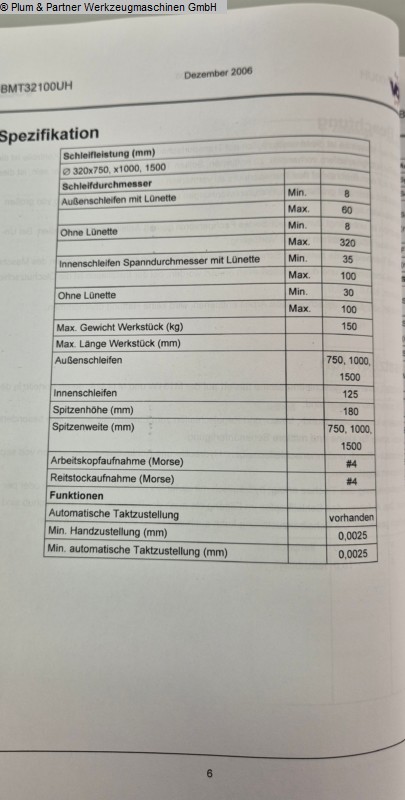 Hydr. Universal-Rundschleifmaschine Bearbeitungslänge 1500 mm, Schleifdurchmesser 320 mm mit Innenschleifeinrichtung. Werkstückspindelkopf drehbar, Tisch schwenkbar, hydr. Längsbewegung des Tisches, hydr. Eilgang des Schleifkopfes, hydr.Zustellung des Schleifkopfes bei Tischumkehr, manuelle + hydr. Verstellung der Reitstockpinole. Weitere Detaildaten siehe Datenblätter Bild 9 + 10. Inbetriebnahme 2015: Die Maschine wurde nur WENIGE STUNDEN für besondere Werkstücke gebraucht und dann blieben die Aufträge aus! Es handelt sich um eine Gebrauchtmaschine, daher verkaufen wir unter Ausschluss jeglicher Gewährleistung. LAGERHALTENDER HAENDLER MIT AUSSTELLUNGSHALLE VON 1600 m²