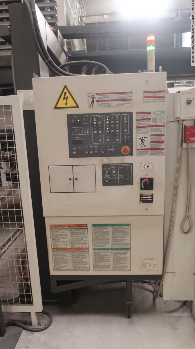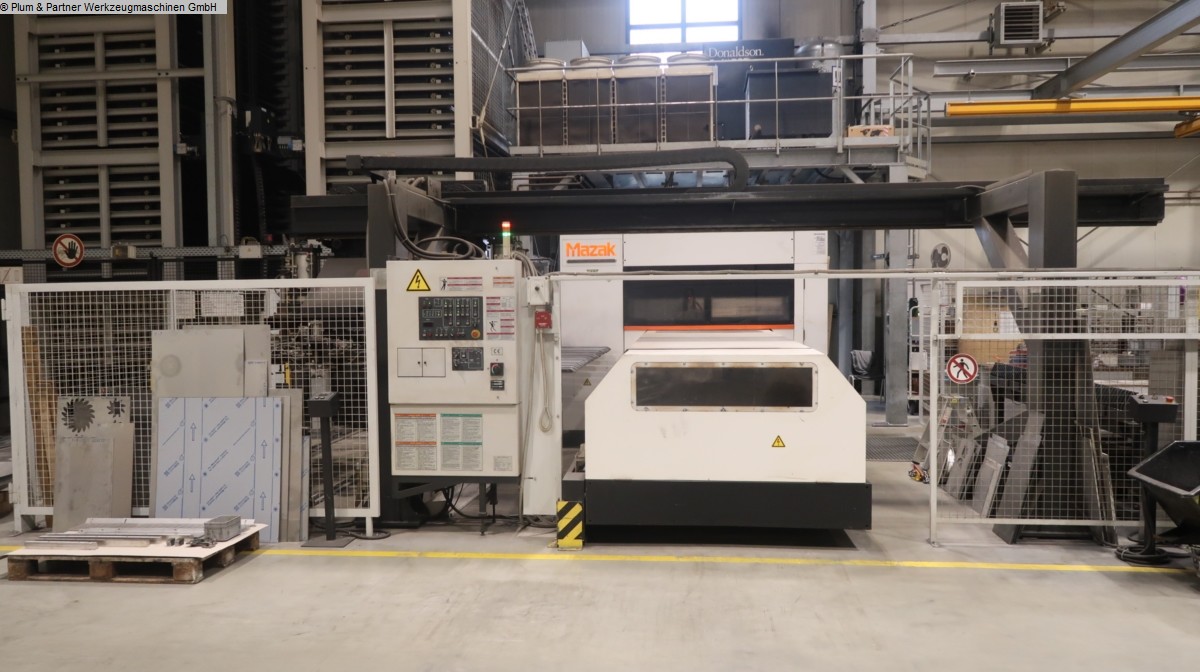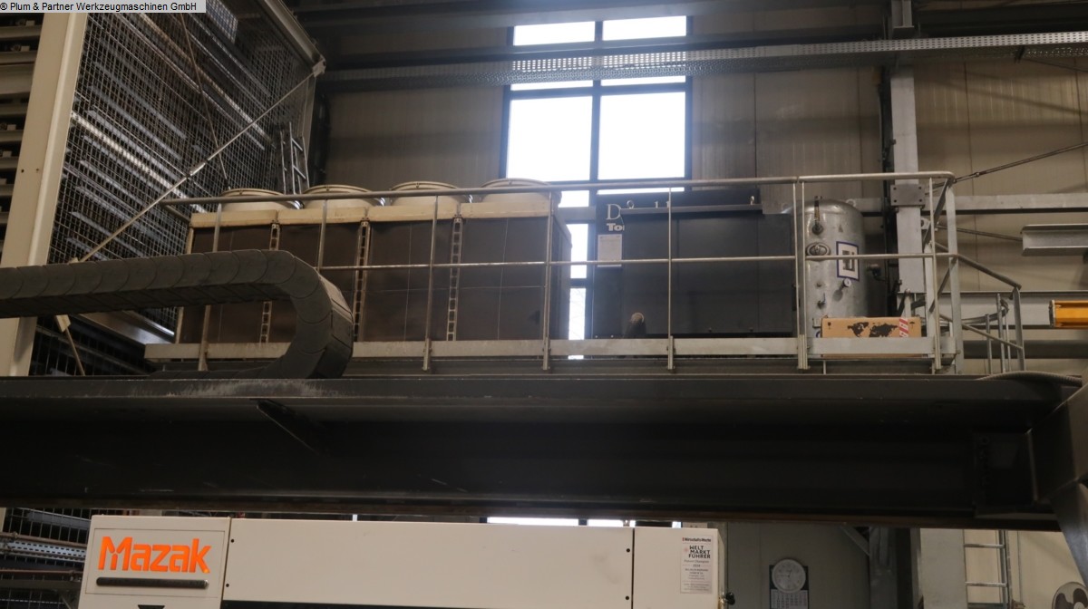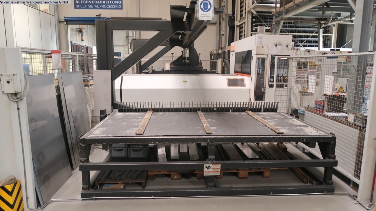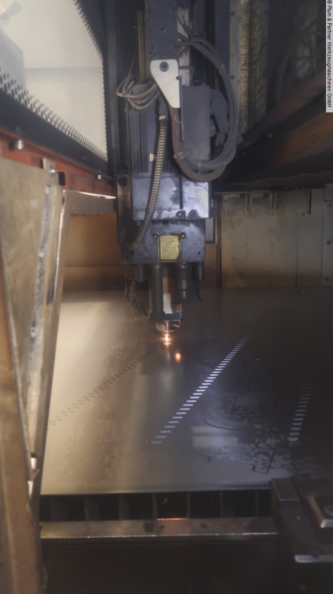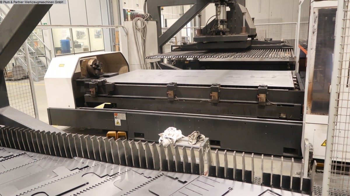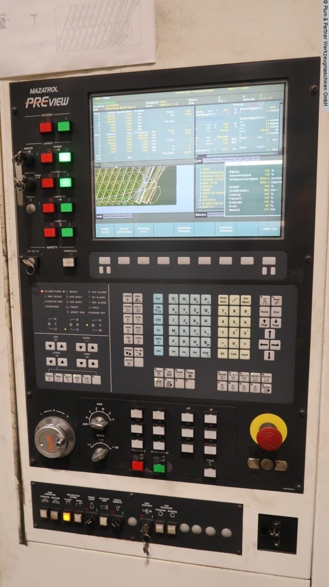 Gut erhaltene Laserschneidanlage(CO2-Gas Laser) mit Verfahrwegen x/y/z = 3260 x 1545 x 430 mm, max. Arbeitsbbereich 1525 x 3050 mm, 3. drehende Achse NC- Drehtisch zur Aufnahme von Rohren, deshalb z-Achse 430mm, Portallader mit Vakuumheber für Zuführung neuer Bleche und Hebeeineheit zur Abnahme der fertigen Bleche sowie Steuerschrank mit Bedienelementen, Gewindebohreinheit mit Bohrermagazin, nach hinten verfahrende Schutzhaube, intelligentes Düsenwechselmagazin, Absaugung Donaldson, Kühlanlage, weitere techn. Daten auf Anfrage. Der Portallader hebt mittels Vakuumheber die Neubleche an, nimmt beim Verfahren automatisch das gelaserte Blech mit auf, setzt das Neublech ab, weiter zum Ablagetisch für das Fertigblech und legt es dort ab - siehe Video 2. Die Absaugung, die Kühlanlage und der Trafo sind auf dem Podest oberhalb der Maschine angebracht. Steuerung Mazatrol Preview M mit Farb-TFT, CPU 64 Bit, Festplatte 20 GB, Programmierung EIA/ISO Format. Es handelt sich um eine Gebrauchtmaschine, daher verkaufen wir unter Ausschluss jeglicher Gewährleistung. ZERTIFIZIERTER HAENDLER DES INTERNETPORTALS MASCHINENSUCHER UND LAGERHALTENDER HAENDLER.