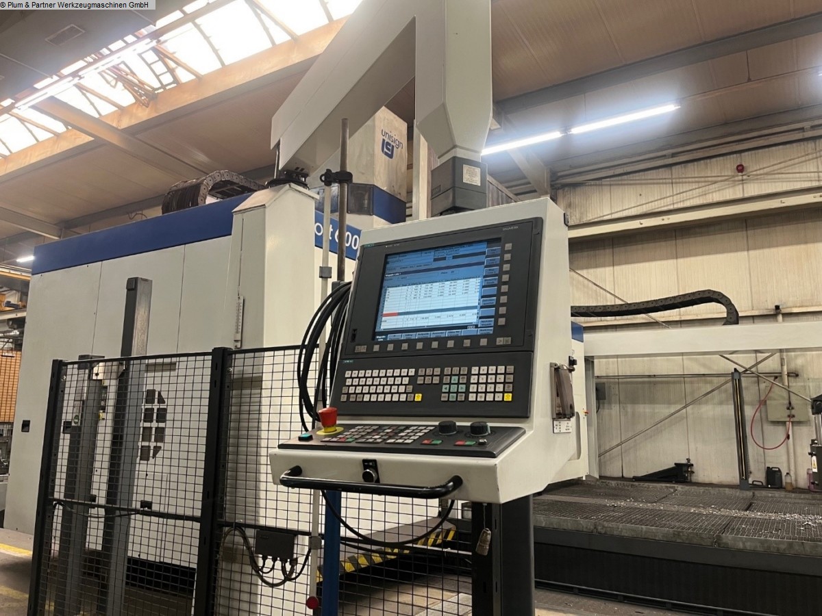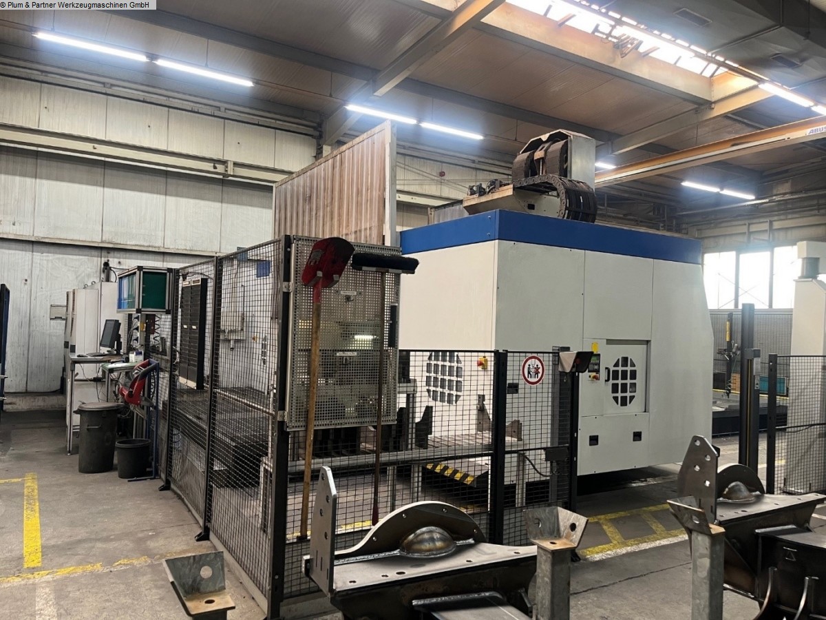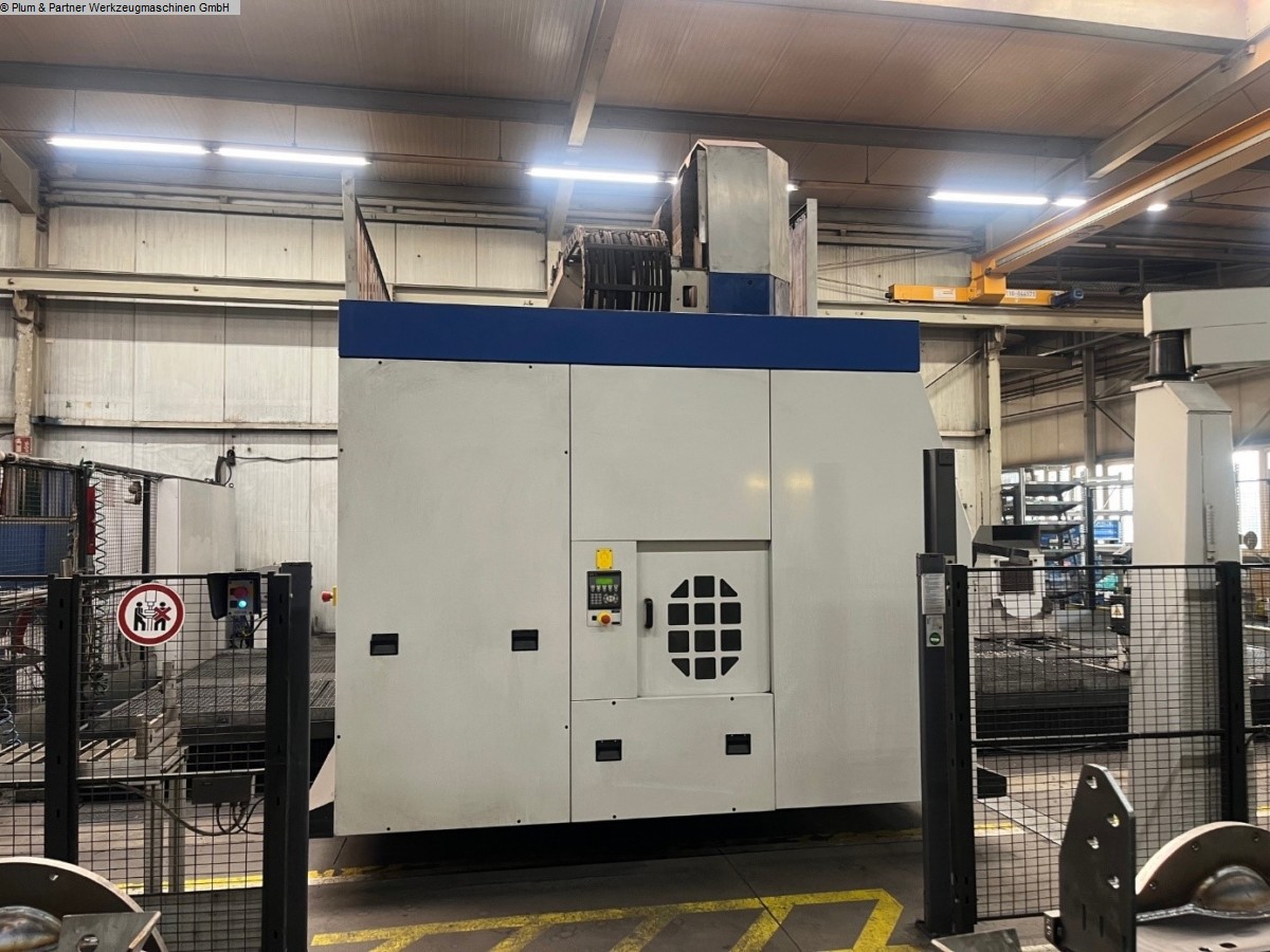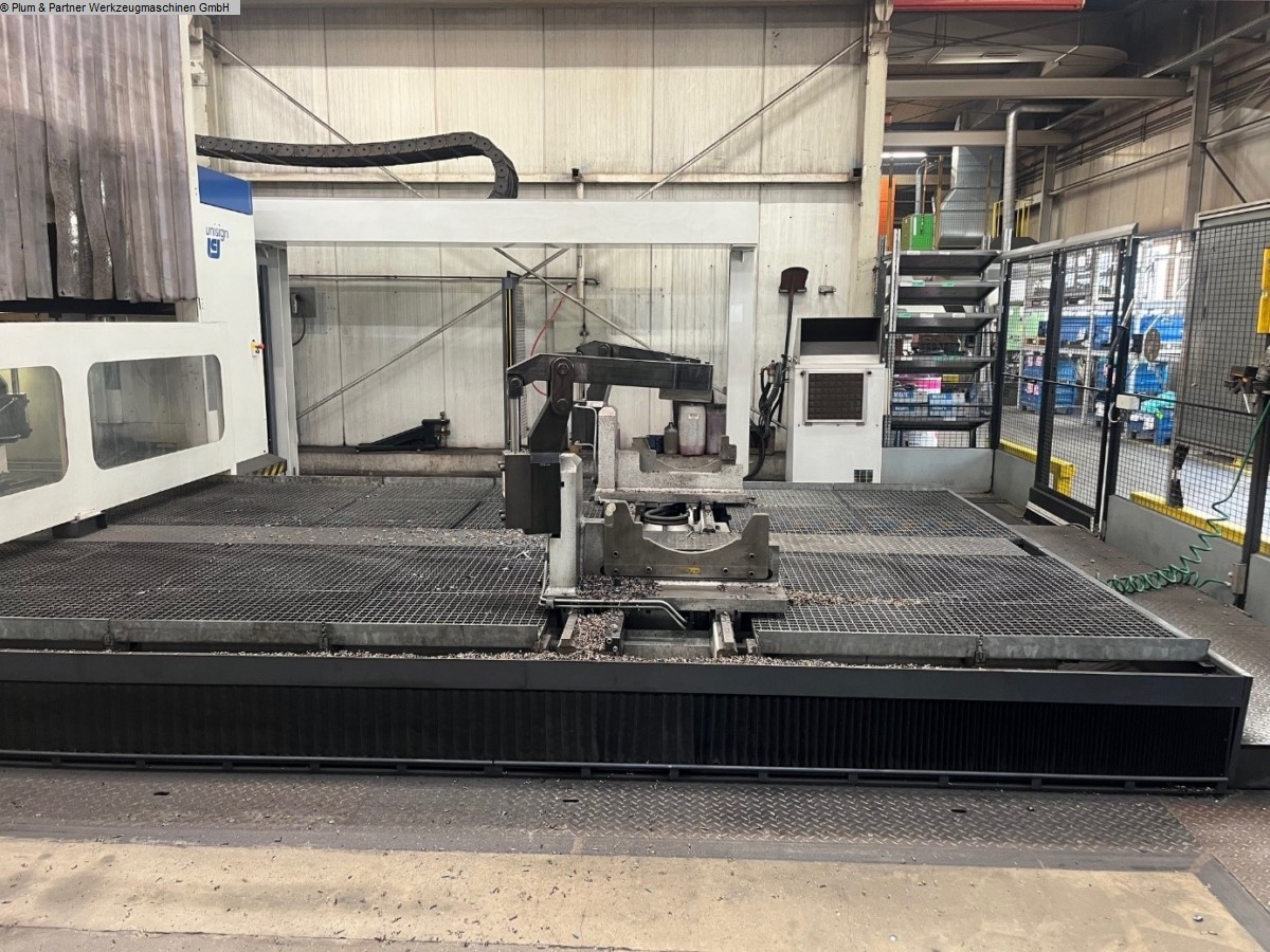 Portalfräsmaschine in Gantry-Bauweise mit verfahrbarer Portalbrücke und stationärem Spanntisch. Eigenschaften: Spanntisch ausgeführt mit Spannbalken in Querrichtung mit jeweils 750mm Zwischenabstand. Die standardmäßigen Plattenfelder entfallen. Plattenfelder müssten bei Bedarf zugekauft werden. Hydraulische Spannvorrichtung mit Spannbrücken zur Achsbearbeitung inkl. Hydraulikanlage Winkelbohr- & Fräskopf, n = 4000 1/min SK50 Hohe Genauigkeit und Stabilität durch Hirthverzahnung Automatischer Werkzeugwechsel in den Winkelkopf Messtaster RWP20.50-M Pendelbetrieb Sicherheitszaun mit Lichtgittern Fabrikat Sick Spanntisch mit Spannbalken in Querrichtung je 750 mm Werkzeugkettenmagazin am Portalständer mit 30 Plätzen Maschinen-Kühlanlage Wasser-Luft-Wärmetauscher im Schaltschrank integriert Unisign Ferndiagnose für Siemens Sinumerik 840 D Makrolon Vorhänge an beiden Seiten der Portalbrücke motorisch in der Höhe verstellbar Trennwand mit Sichtscheibe Späneförderer mit Scharnierbandausführung. Aufstell.- und Ausrichtelemente Dokumentation Zubehör: 1 Stück Winkelbohr- & Fräskopf SK50 im Ersatz 1 Stück Hexagon Messtaster RWP 20.50-M als Ersatz 1 Stück Spannfeld mit T-Nuten 2500x 1200mm welches statt der hydraulischen Vorrichtung auf der Maschine installiert werden kann. Diverse Ersatzteile