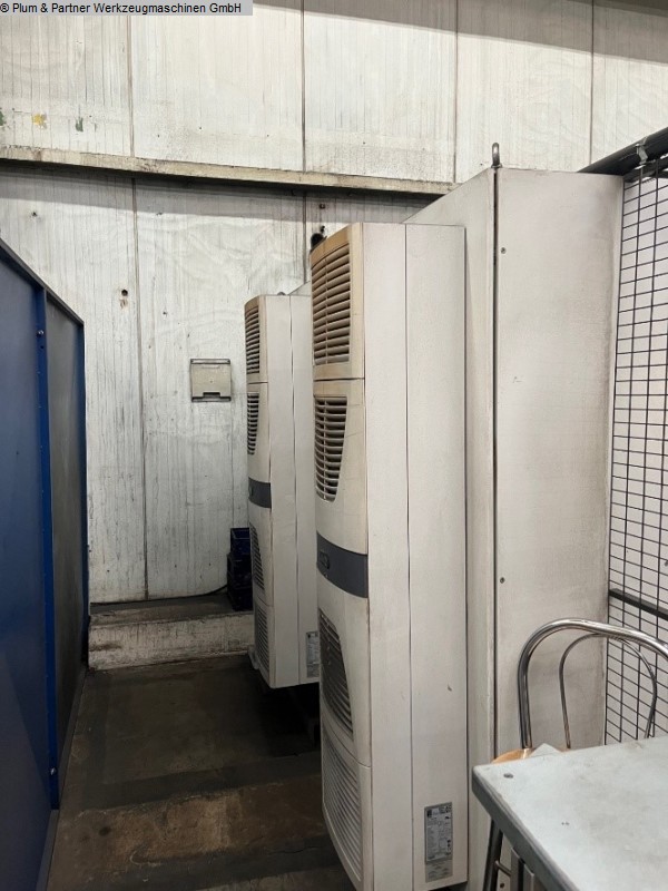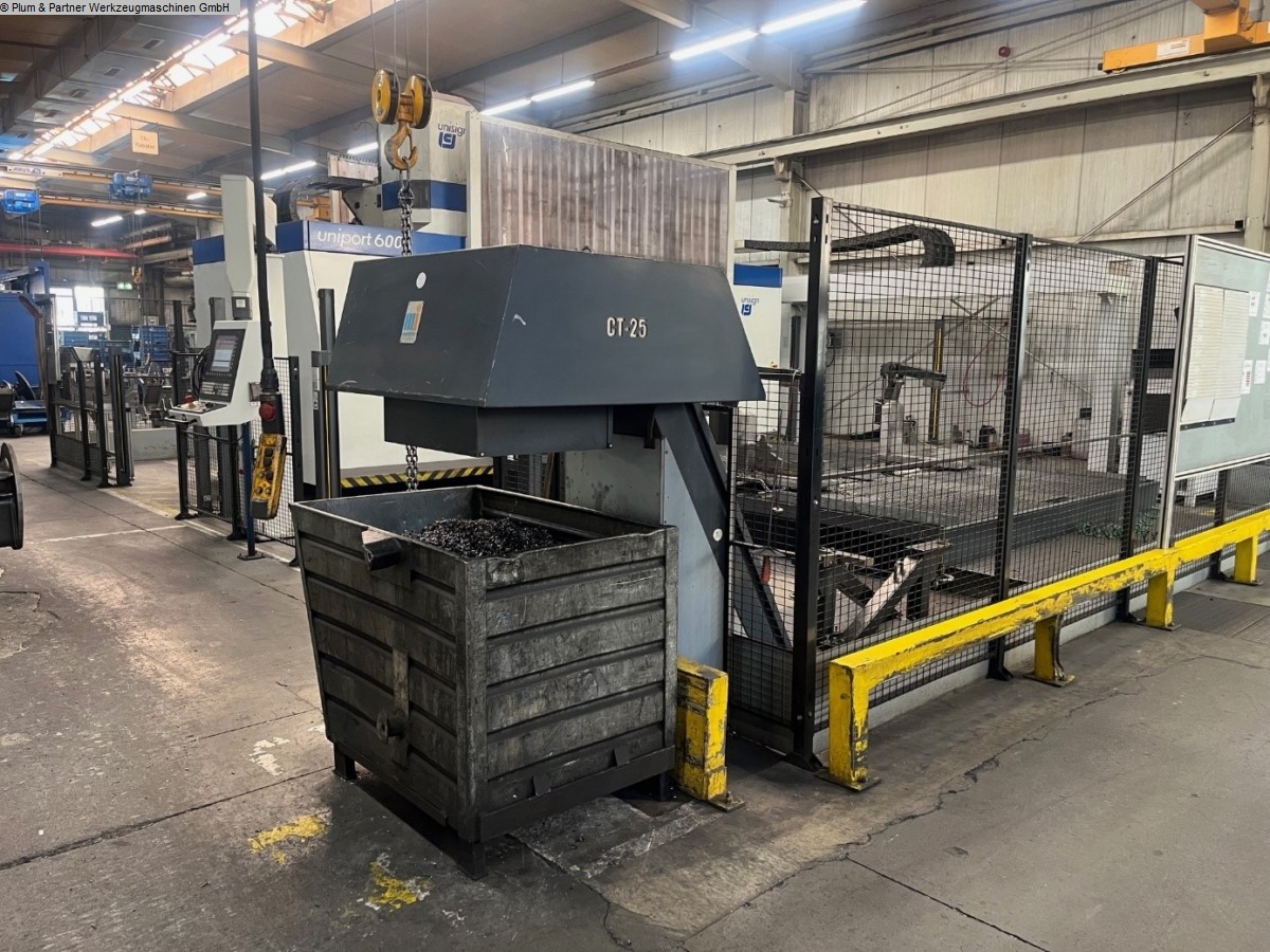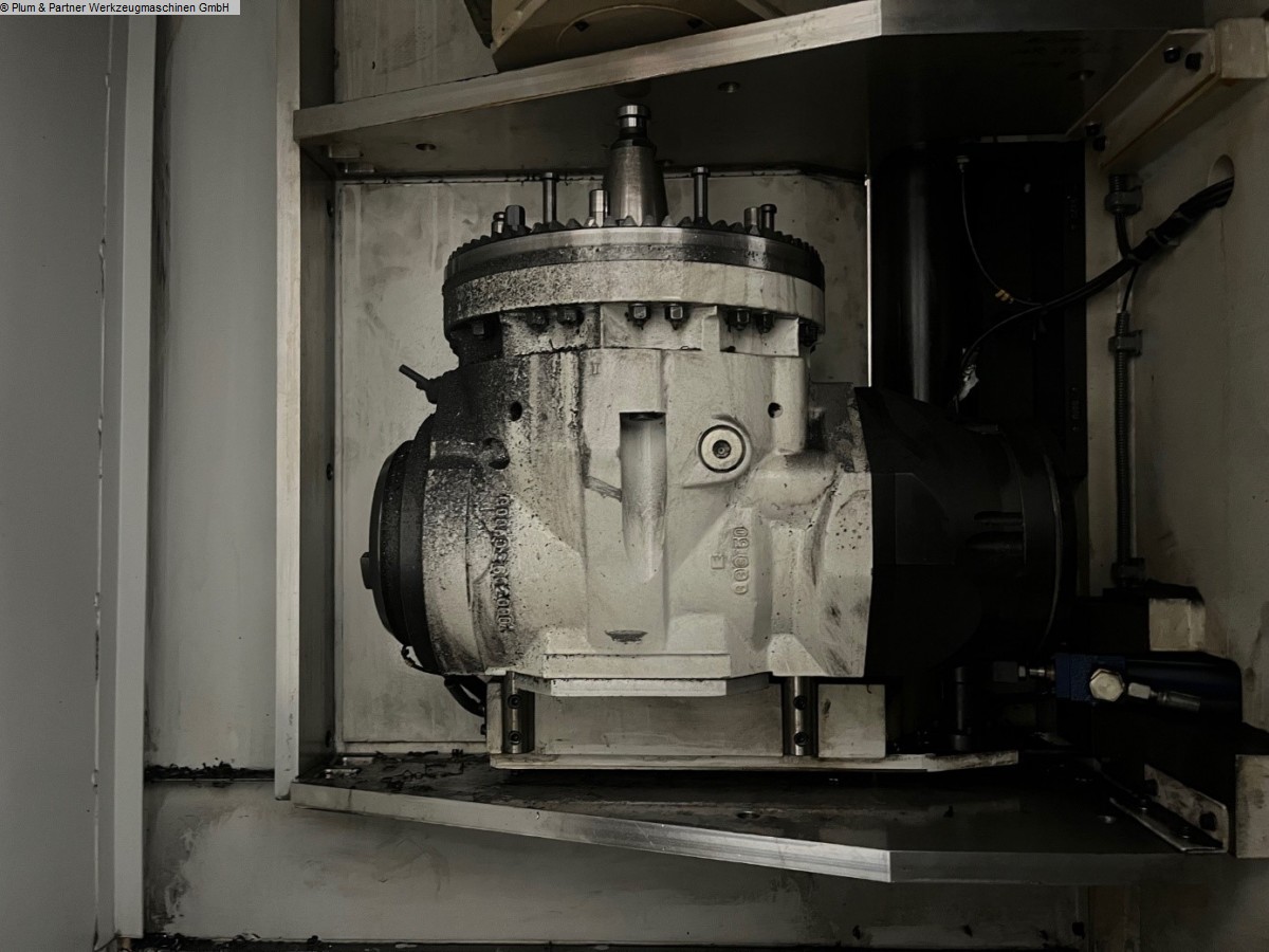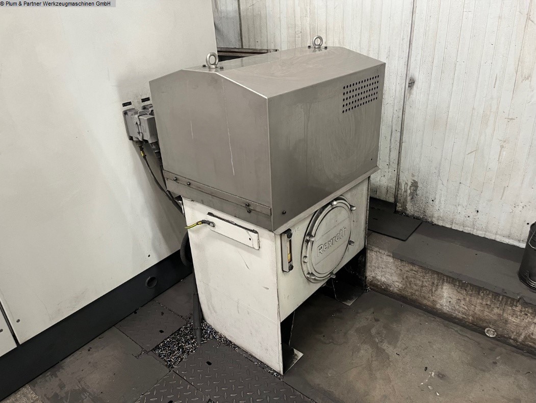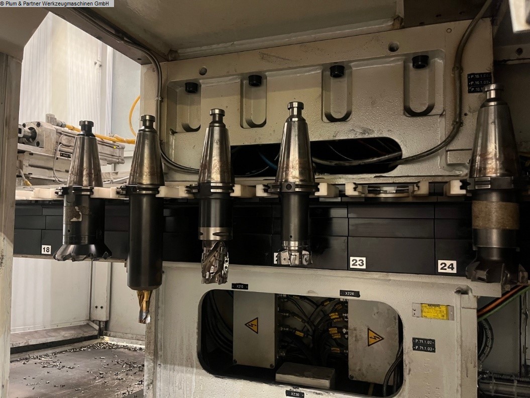 Portalfräsmaschine in Gantry-Bauweise mit verfahrbarer Portalbrücke und stationärem Spanntisch. Eigenschaften: Spanntisch ausgeführt mit Spannbalken in Querrichtung mit jeweils 750mm Zwischenabstand. Die standardmäßigen Plattenfelder entfallen. Plattenfelder müssten bei Bedarf zugekauft werden. Hydraulische Spannvorrichtung mit Spannbrücken zur Achsbearbeitung inkl. Hydraulikanlage Winkelbohr- & Fräskopf, n = 4000 1/min SK50 Hohe Genauigkeit und Stabilität durch Hirthverzahnung Automatischer Werkzeugwechsel in den Winkelkopf Messtaster RWP20.50-M Pendelbetrieb Sicherheitszaun mit Lichtgittern Fabrikat Sick Spanntisch mit Spannbalken in Querrichtung je 750 mm Werkzeugkettenmagazin am Portalständer mit 30 Plätzen Maschinen-Kühlanlage Wasser-Luft-Wärmetauscher im Schaltschrank integriert Unisign Ferndiagnose für Siemens Sinumerik 840 D Makrolon Vorhänge an beiden Seiten der Portalbrücke motorisch in der Höhe verstellbar Trennwand mit Sichtscheibe Späneförderer mit Scharnierbandausführung. Aufstell.- und Ausrichtelemente Dokumentation Zubehör: 1 Stück Winkelbohr- & Fräskopf SK50 im Ersatz 1 Stück Hexagon Messtaster RWP 20.50-M als Ersatz 1 Stück Spannfeld mit T-Nuten 2500x 1200mm welches statt der hydraulischen Vorrichtung auf der Maschine installiert werden kann. Diverse Ersatzteile