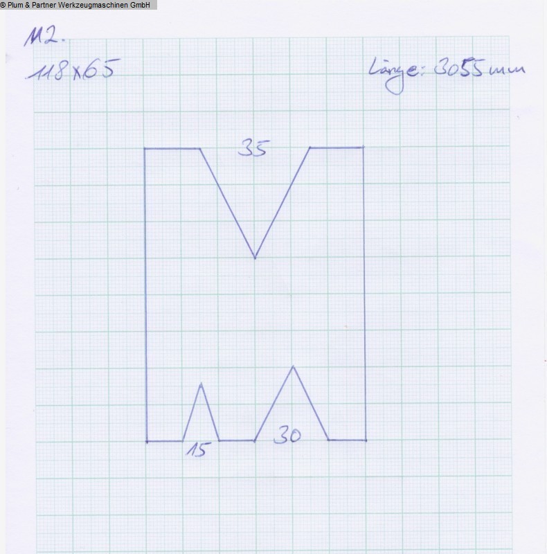 Various tooling: 2: 118 x 65 x 3055 mm, dimensions see sketch, price = 550, - Tool No. 4:_ 60 x 40 mm with 4-fold opening: 30, 10, 9, 7 mm, length 3050 mm, Price 750. No. 3: Bottom rail for split bottom tools (matrices) 80 x 30 mm, opening 40 mm, length 3050 mm, price 350 Tool 70 x 70 mm with 4-fold opening: 10, 10, 20, 30 mm. 2 pieces: 1500mm and 1300mm. Price 750. (Photo 5 & 6) Prices excl. VAT Machine dealer with own stock of 1600 m².