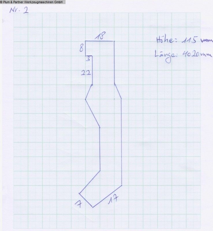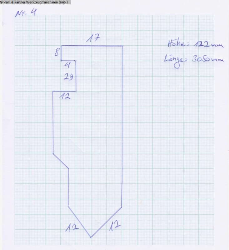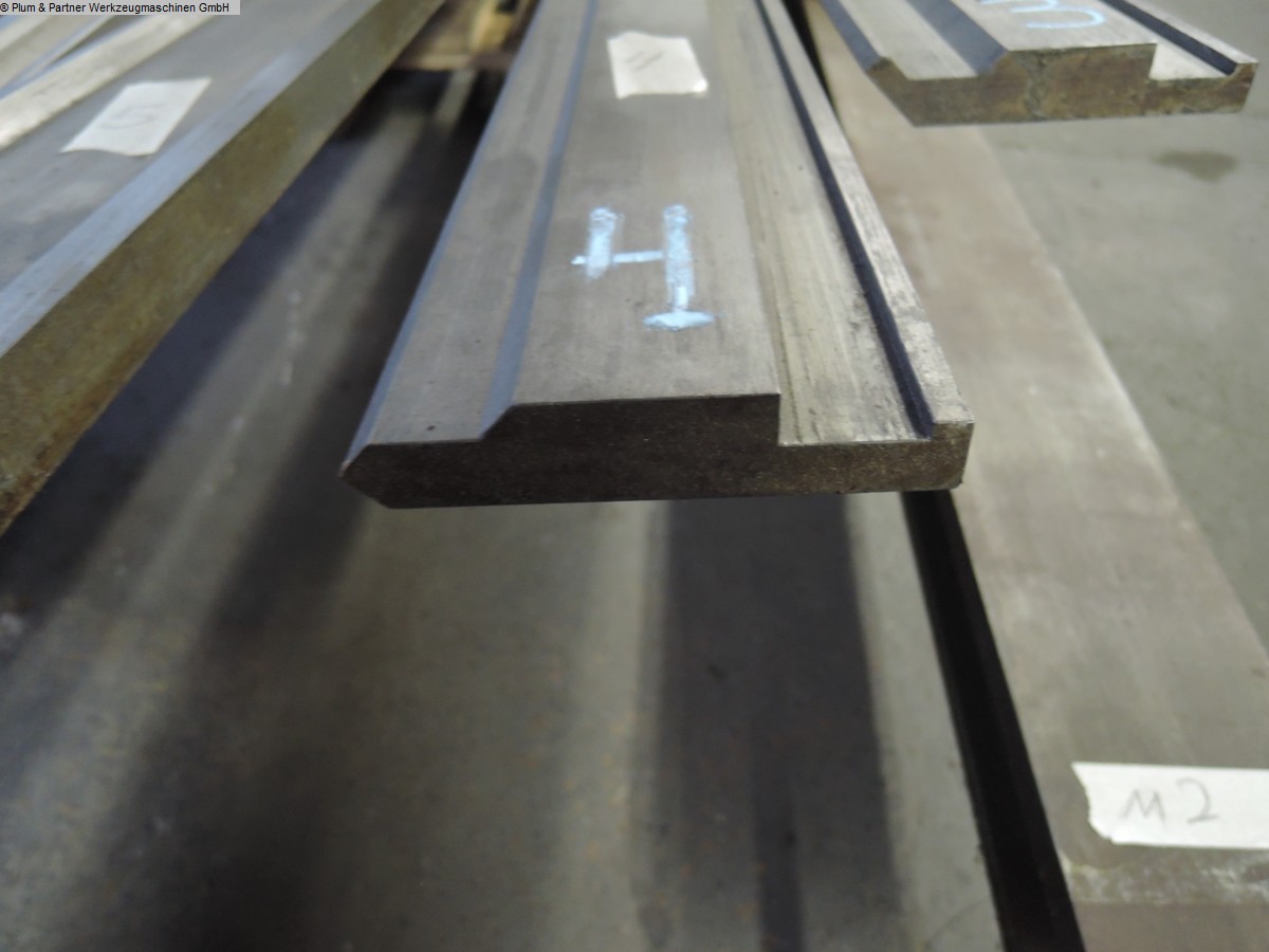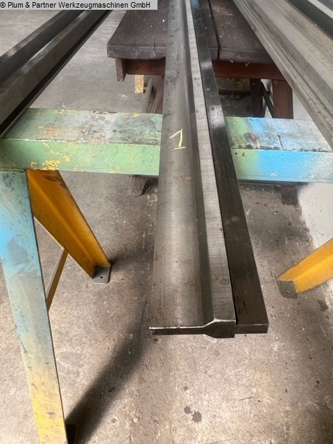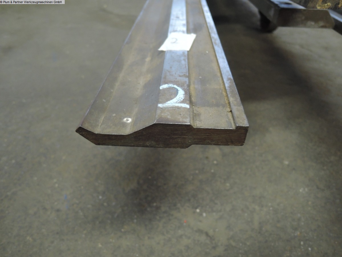 4 pieces of upper tools for press brake: Deer foot upper tool No.1, picture. No. 2: Dimensions: 3000 x 75 mm, price = 670,-- Deer foot upper tool No.2, picture. No. 3: Dimensions: 3000 x 120 mm, price = 670,-- Deer foot upper tool No.2 length: 4020 mm, dimensions see sketch, price = 780.-- (Image 5 & 6) Deer foot upper tool No.4 length: 3050 mm, dimensions see sketch, price = 650.-- Prices plus VAT (Image 7 & 8) Machine dealer with own stock of 1600 m².