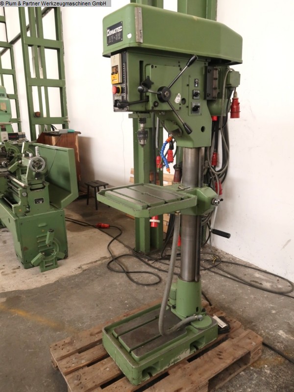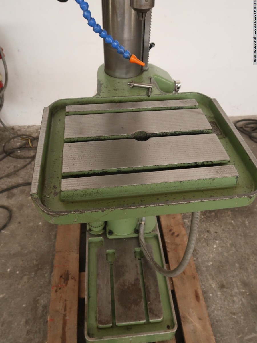 A pillar drill press from a school that has seen little use, featuring infinitely variable speed control, a 2-speed motor, automatic spindle feed, reverse and reverse rotation, a rack-and-pinion table with adjustable table height, and a coolant pump. The year of manufacture is estimated! Machine dealer with own stock of 1600 m².