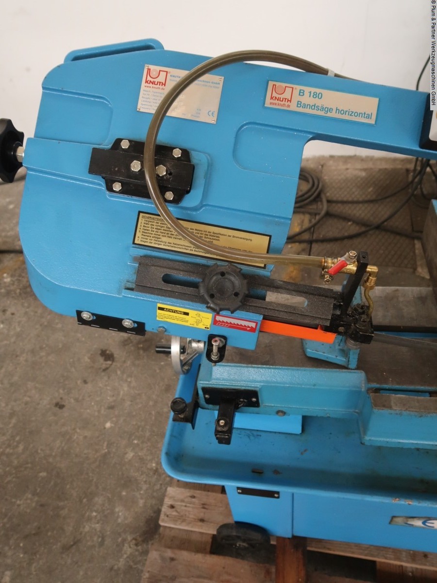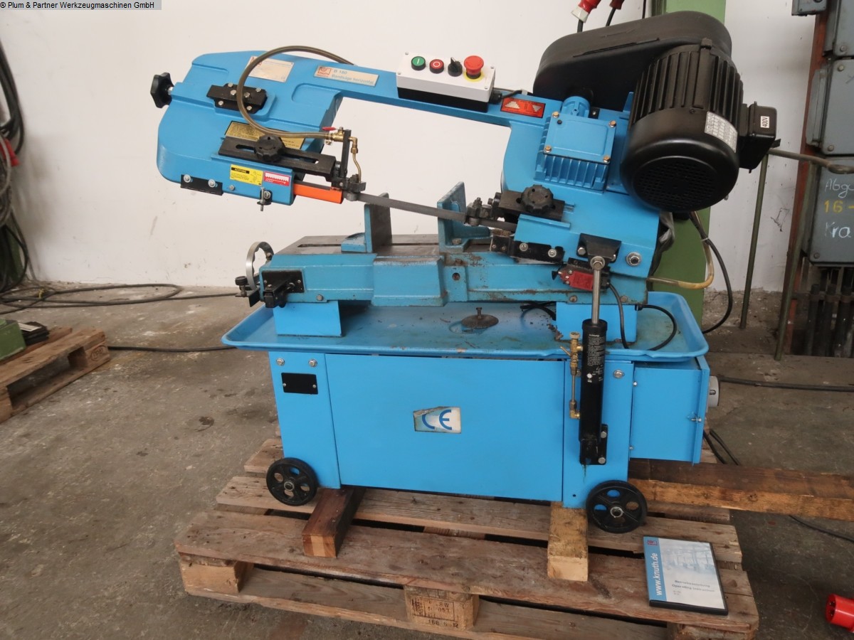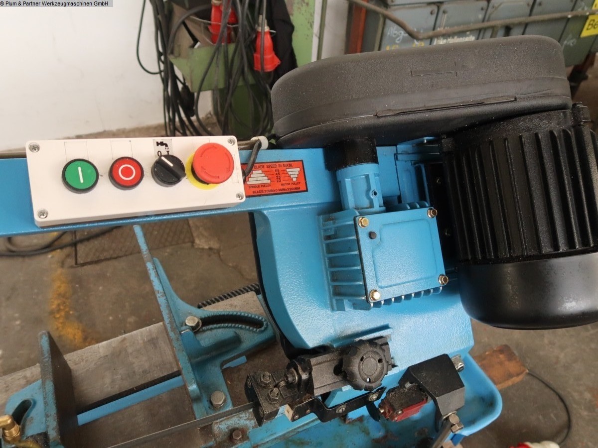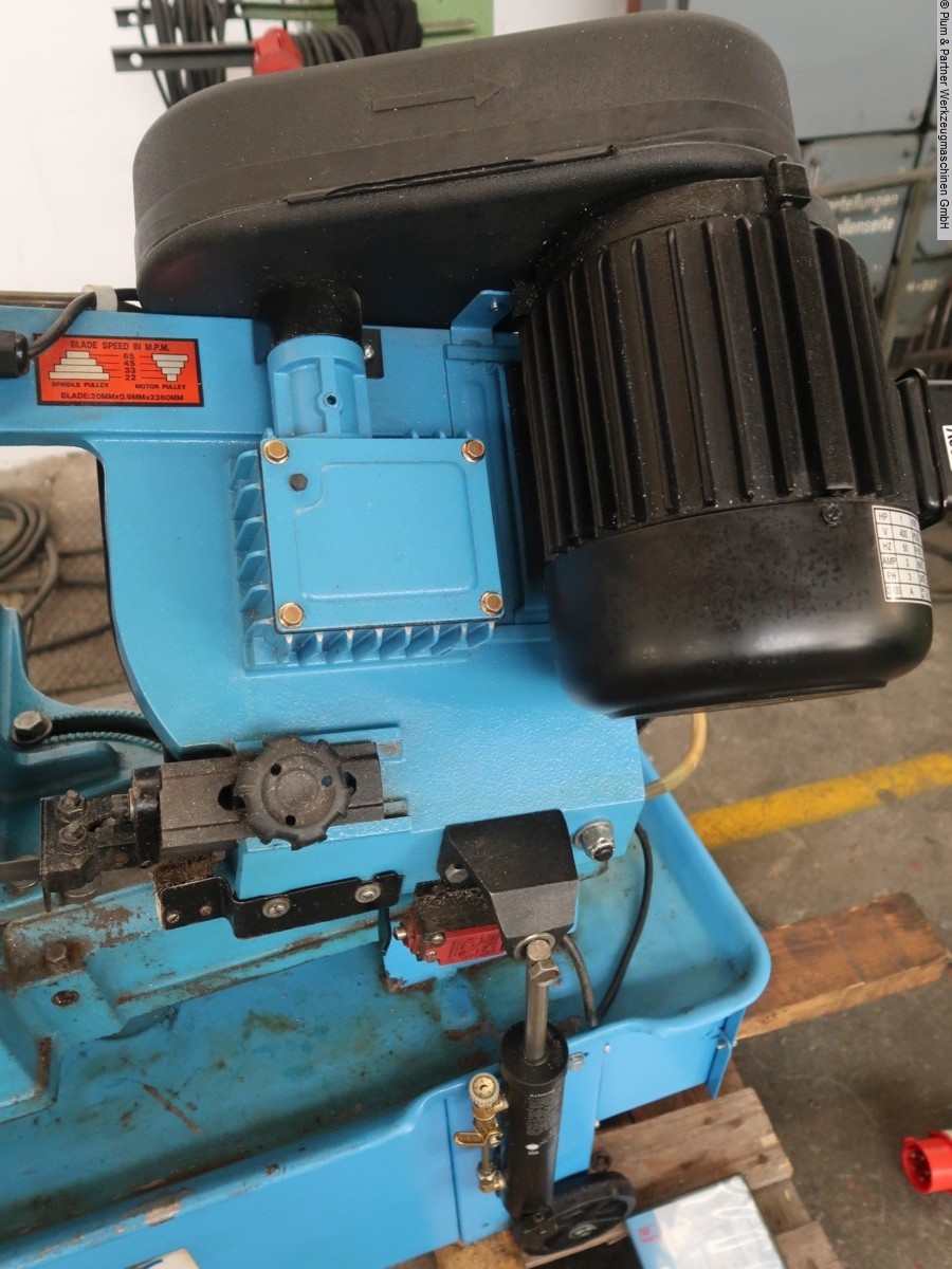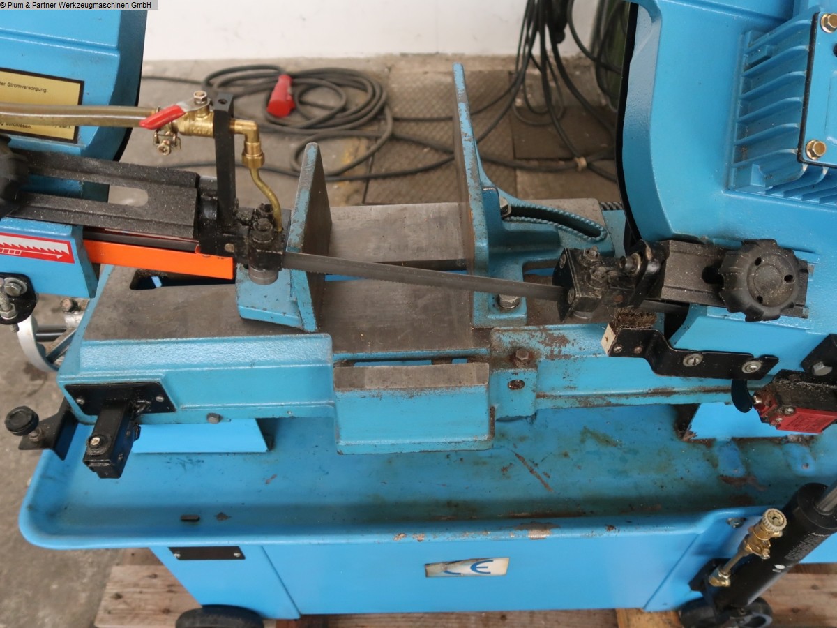 Horizontal band saw on rollers, infinitely adjustable support pressure via hydraulic cylinder, 4 cutting speeds adjustable via step pulley, coolant system, and miter-adjustable clamping jaws. Machine dealer with own stock of 1600 m².