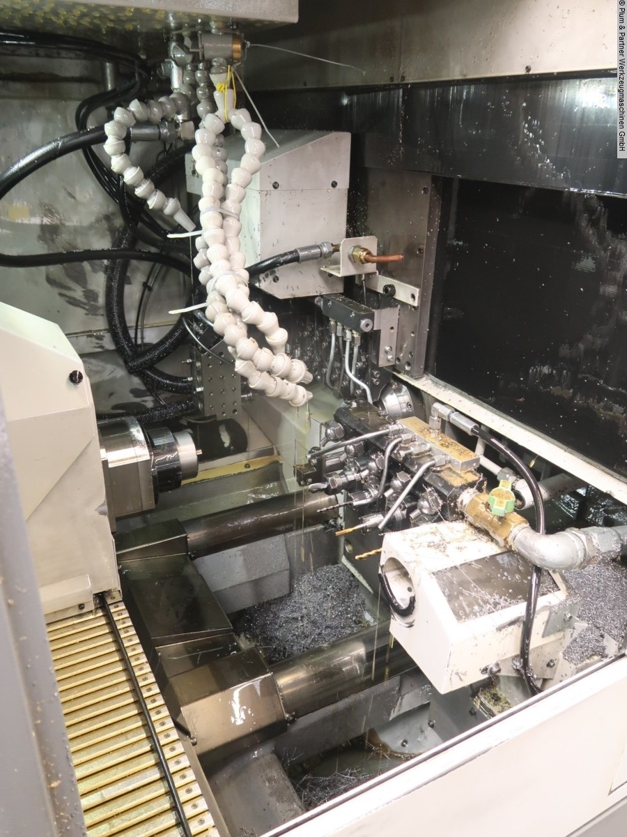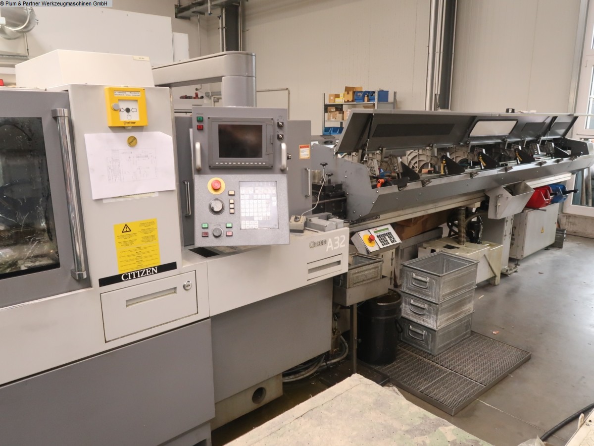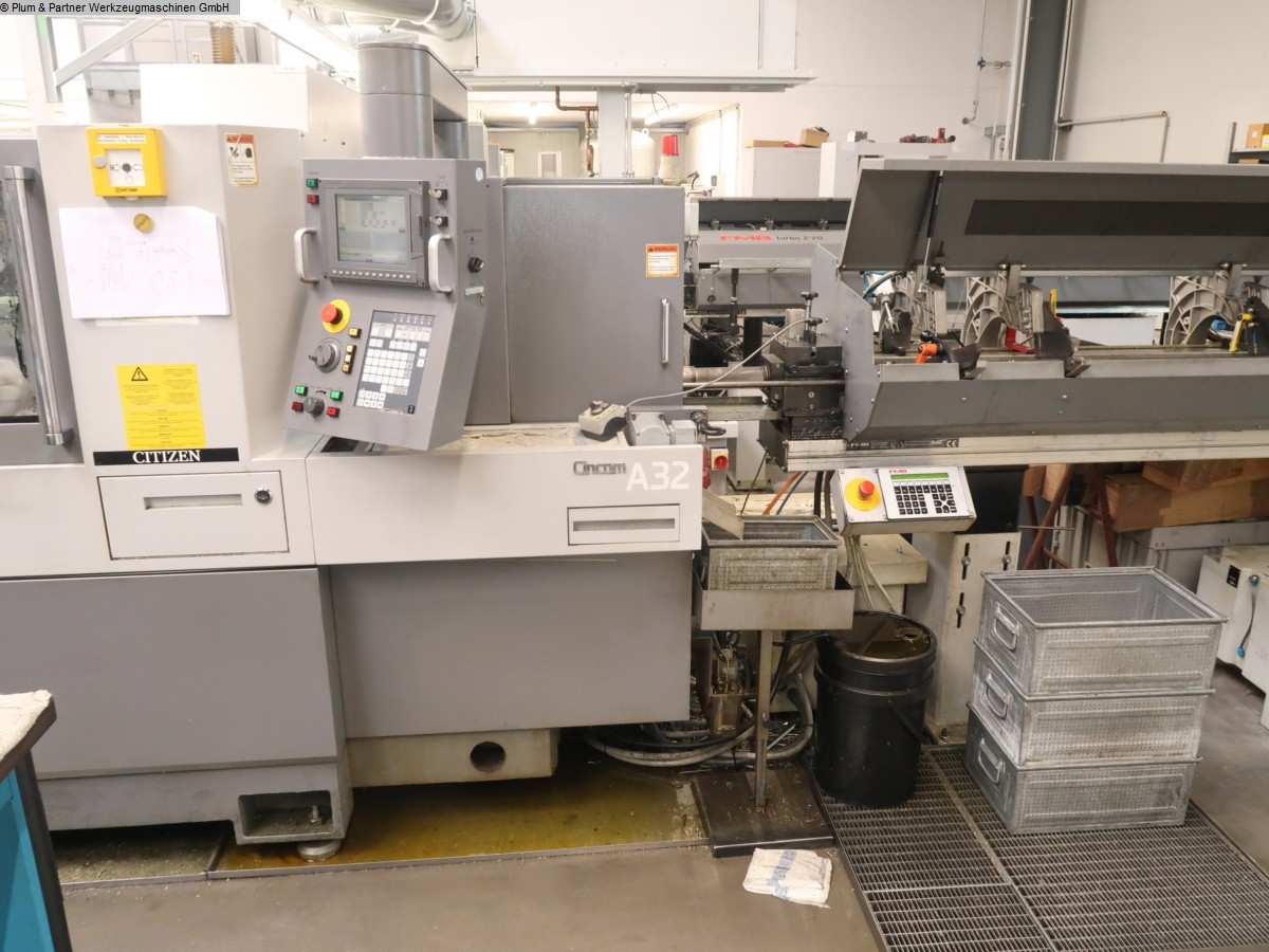 CNC Swiss-Type Lathe Citizen A32-VII (R) with FMB Turbo 3-36 3200 Var.C loading magazine. Sold due to restructuring. Machine with 7 axes (X1, Y1, Z1, X2, Z2, C1, C2) in the main spindle version on the right, vertical holder for 4 driven turning tools + 3 parting tools and + 4 drilling tools. Tool holder for the rear side with 5 stations - see sketch Figure 10. Counter (pick-off) spindle. Simultaneous machining. The machine was regularly serviced by Citizen Europe, and wear parts were last replaced in June 2025. The fire protection system was replaced in June 2025, and the bearings were replaced in June 2024. Equipment: Collet chuck for spindle + pick-off spindle / Synchronously driven guide bushing / Drive unit for guide bushing / Workpiece ejection device / Cross-machining drive unit including 4 spindles / Door lock / Pick-off spindle / Parts receiving basket + conveyor belt / Pneumatic unit for air sealing / Interior work light / 3-color warning lights / Parting tool breakage detection / COMBISTREAM high-pressure coolant system + chip conveyor, 8 outlets, 130 bar / 4-way driven tool for back machining / "Long parts" option 600 mm with parts container, guide tube, and spindle nut / Loading magazine with various material guides (7, 12, 20, 36), adapters, telescopic tubes and inserts / CO2 fire extinguishing system with FB 703 drilling system control system including flame and thermal maximum detector Manual release. Features of the CINCOM SYSTEM M70PLC CNC control system: Multi-axis CNC system for simultaneous or individual machining / Cutting radius compensation / Multiple cycle repetitions / Deep hole drilling cycle / Constant cutting speed / Chamfer and radii insertion / Constant cutting speed of the pick-up spindle / Thread chamfering on the pick-up spindle Main spindle C-axis Pick-up spindle C-axis Main and pick-up spindle synchronization / Synchronous tapping on the main and pick-up spindles as well as with the driven tools / Synchronous thread cutting on the main and pick-up spindles / Geometric function / Collision detection / 8.4" color liquid crystal display (LCD) /