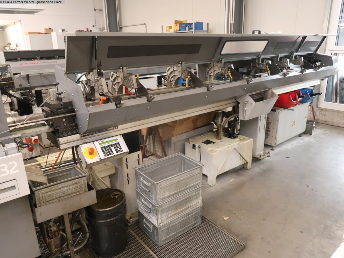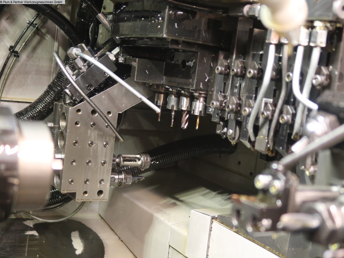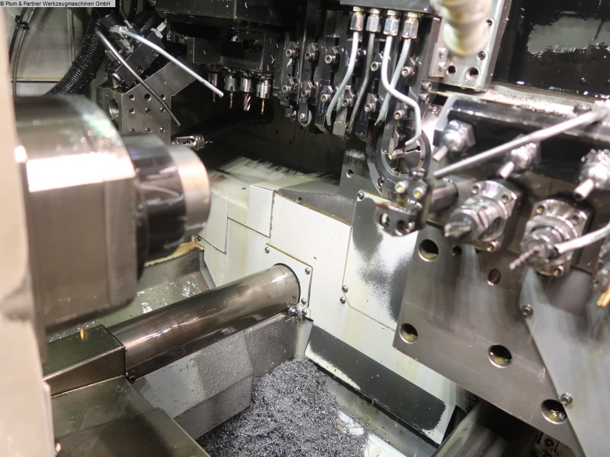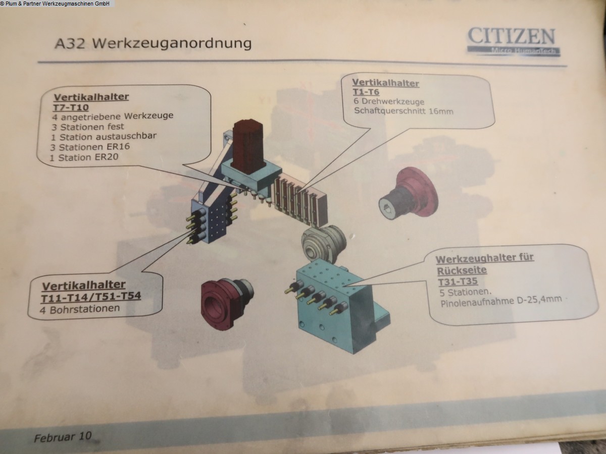CNC Swiss-Type Lathe Citizen A32-VII (R) with FMB Turbo 3-36 3200 Var.C loading magazine. Sold due to restructuring. Machine with 7 axes (X1, Y1, Z1, X2, Z2, C1, C2) in the main spindle version on the right, vertical holder for 4 driven turning tools + 3 parting tools and + 4 drilling tools. Tool holder for the rear side with 5 stations - see sketch Figure 10. Counter (pick-off) spindle. Simultaneous machining. The machine was regularly serviced by Citizen Europe, and wear parts were last replaced in June 2025. The fire protection system was replaced in June 2025, and the bearings were replaced in June 2024. Equipment: Collet chuck for spindle + pick-off spindle / Synchronously driven guide bushing / Drive unit for guide bushing / Workpiece ejection device / Cross-machining drive unit including 4 spindles / Door lock / Pick-off spindle / Parts receiving basket + conveyor belt / Pneumatic unit for air sealing / Interior work light / 3-color warning lights / Parting tool breakage detection / COMBISTREAM high-pressure coolant system + chip conveyor, 8 outlets, 130 bar / 4-way driven tool for back machining / "Long parts" option 600 mm with parts container, guide tube, and spindle nut / Loading magazine with various material guides (7, 12, 20, 36), adapters, telescopic tubes and inserts / CO2 fire extinguishing system with FB 703 drilling system control system including flame and thermal maximum detector Manual release. Features of the CINCOM SYSTEM M70PLC CNC control system: Multi-axis CNC system for simultaneous or individual machining / Cutting radius compensation / Multiple cycle repetitions / Deep hole drilling cycle / Constant cutting speed / Chamfer and radii insertion / Constant cutting speed of the pick-up spindle / Thread chamfering on the pick-up spindle Main spindle C-axis Pick-up spindle C-axis Main and pick-up spindle synchronization / Synchronous tapping on the main and pick-up spindles as well as with the driven tools / Synchronous thread cutting on the main and pick-up spindles / Geometric function / Collision detection / 8.4" color liquid crystal display (LCD) /
